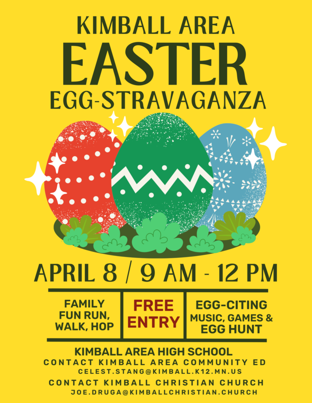 Kimball Area Community Ed has partnered with Kimball Christian Church to host the 2023 Easter Egg-stravaganza on April 8 from 9 am - 12 pm at the Kimball Area High School. The special event is free to the public and will feature an Easter Egg Hunt, Carnival, a Family Fun Run/Walk/Hop and photo opportunities with the Easter Bunny. All are welcome to come and enjoy some Easter festivities!