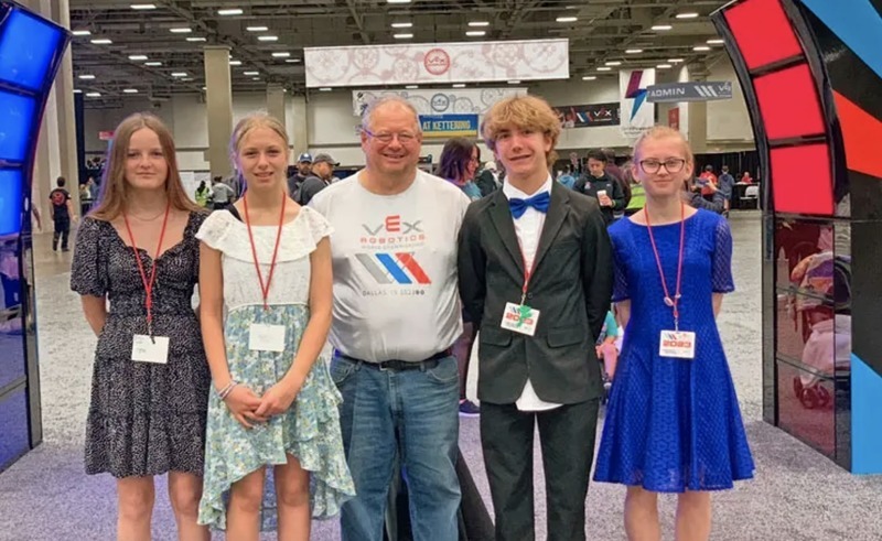 Representing Kimball’s Team 739E in the middle school division at VEX World 2023 in Dallas were (from left): Isabelle Just, Brooke Mertens, head coach Kevin Kieke, Tyler Charboneau and Erin Helgeson.