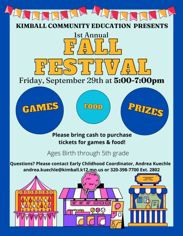 Kimball Area Community Education is hosting its first annual Fall Festival on Friday, Sept. 29, from 5-7 pm at the elementary school. Families with children ages birth-5th grade are welcome to attend.