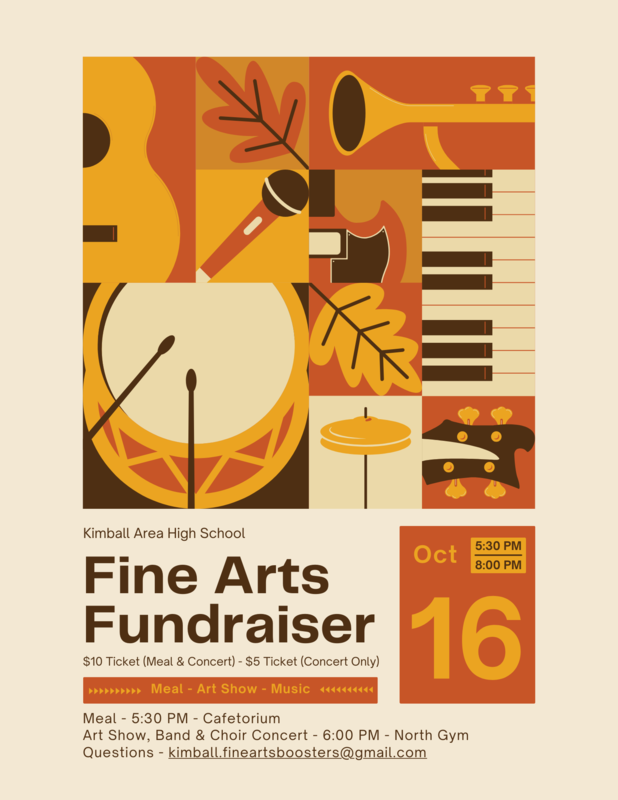 The Kimball Fine Arts Department will host a fundraising meal, music concert, and Art Show at 6:00 p.m. on Monday, Oct. 16, in the North Gym at the Kimball Area High School.