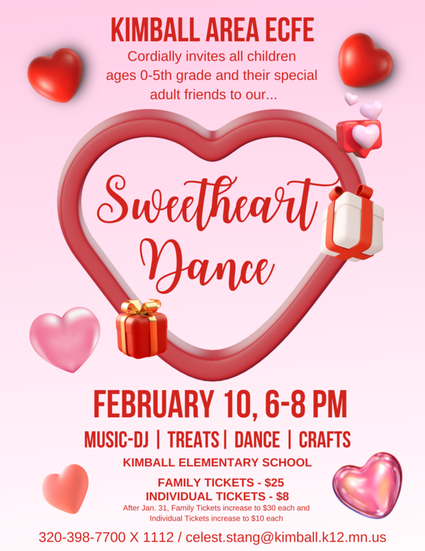 Kimball Area's ECFE program cordially invites all children (ages 0-5th grade) to bring their favorite adult to our upcoming Sweetheart Dance on Feb. 10 from 6-8 pm at the Kimball Elementary School.